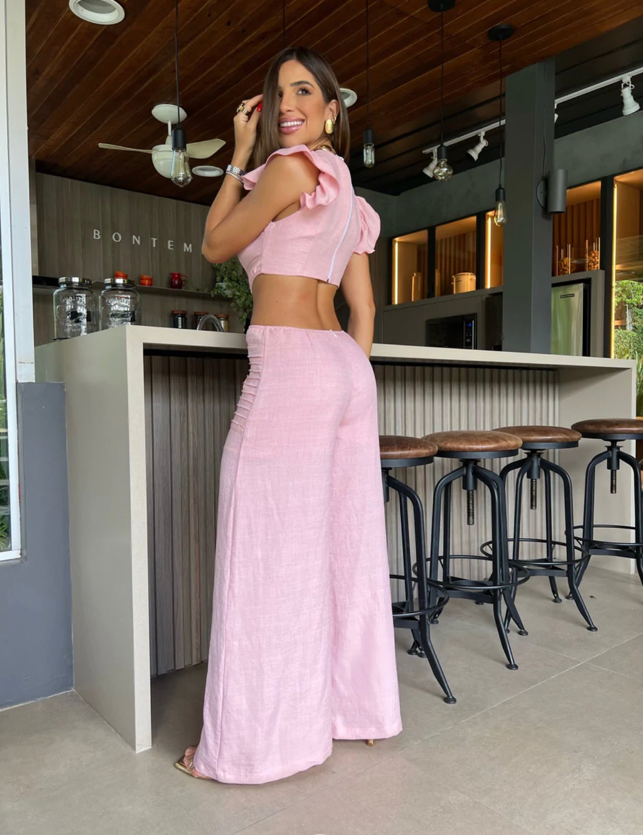Another super cool jumpsuit! In pink linen, it has a shape with cutouts, sewing designs on the sides and ruffles on the sleeves.