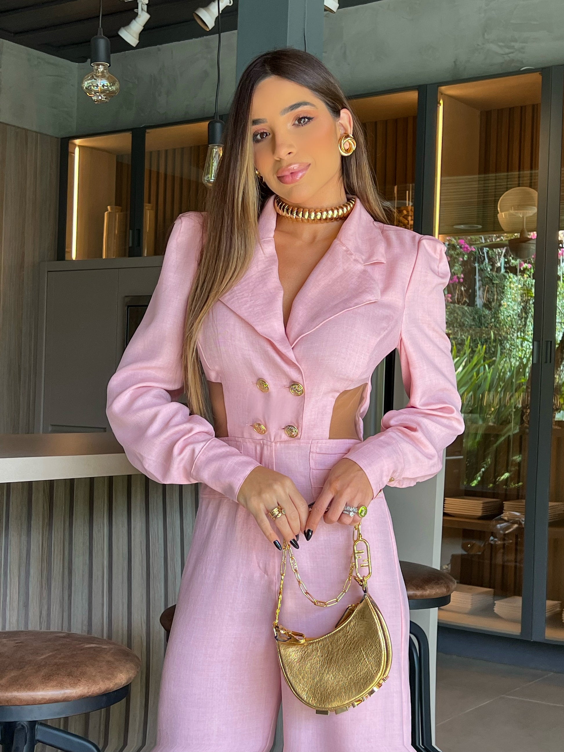 Pink linen jumpsuit. Detail of collars, side cutouts and seam design on the sides of the waist. Composition golden buttons. Elegant and distinguished.